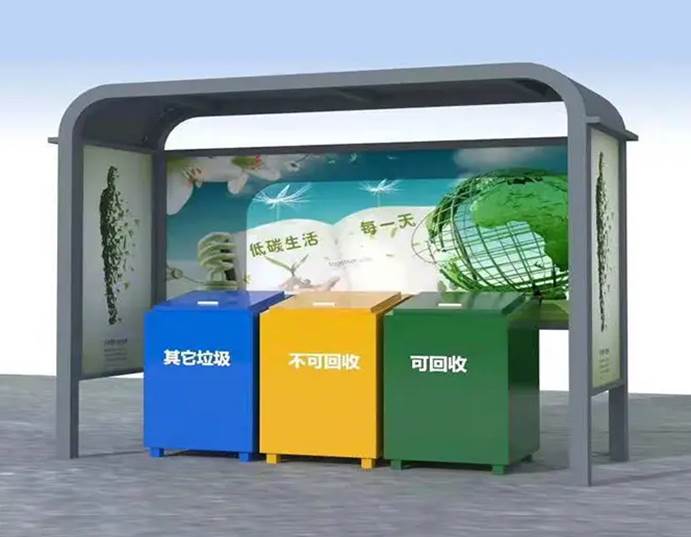 10、宣傳牌:側(cè)面設(shè)置垃圾分類宣傳牌,它可以起到宣傳教育、引導(dǎo)、美化環(huán)境和公益推廣的作用,有助于提高人們的環(huán)保意識和參與度,促進(jìn)垃圾分類的規(guī)范化、標(biāo)準(zhǔn)化和普及化。
